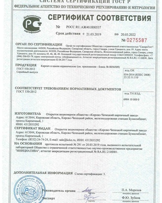 - Сертификат соответствия с ГОСТ 530-2012; пройдены испытания и сертификация в РБ